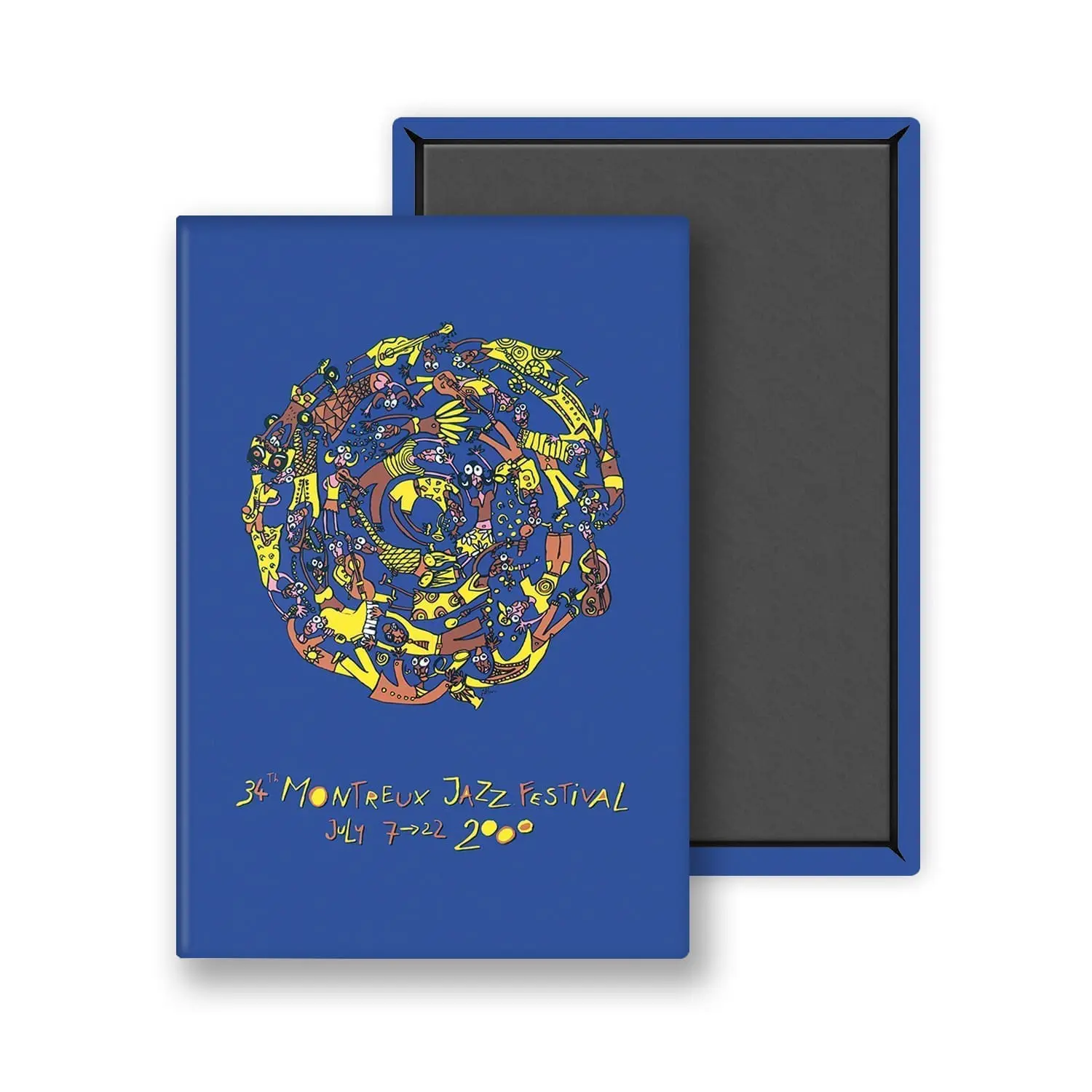 Ce magnet fait partie de la gamme Albin Christen, qui est encore un inconnu quand cette affiche de l’édition de l’an 2000 est dévoilée. Le jeune graphiste vaudois de 25 ans n’en était pourtant pas à son coup d’essai. Trois ans plus tôt, à peine sorti de l’école d’arts graphiques, il avait proposé un projet d’affiche au Montreux Jazz, refusé à l’époque.