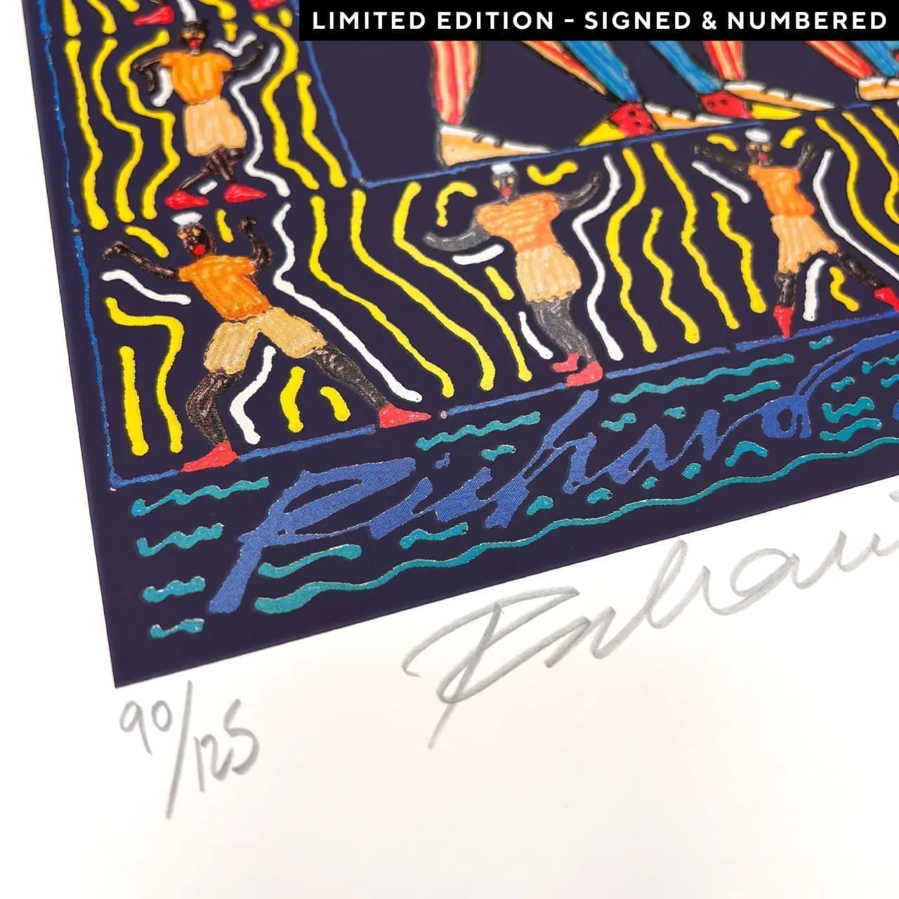 Édition limitée à 125 exemplaires. Signée et numérotée. Sérigraphie 4 couleurs. Vernis UV partiel. Imprimé sur papier offset 350gm2.