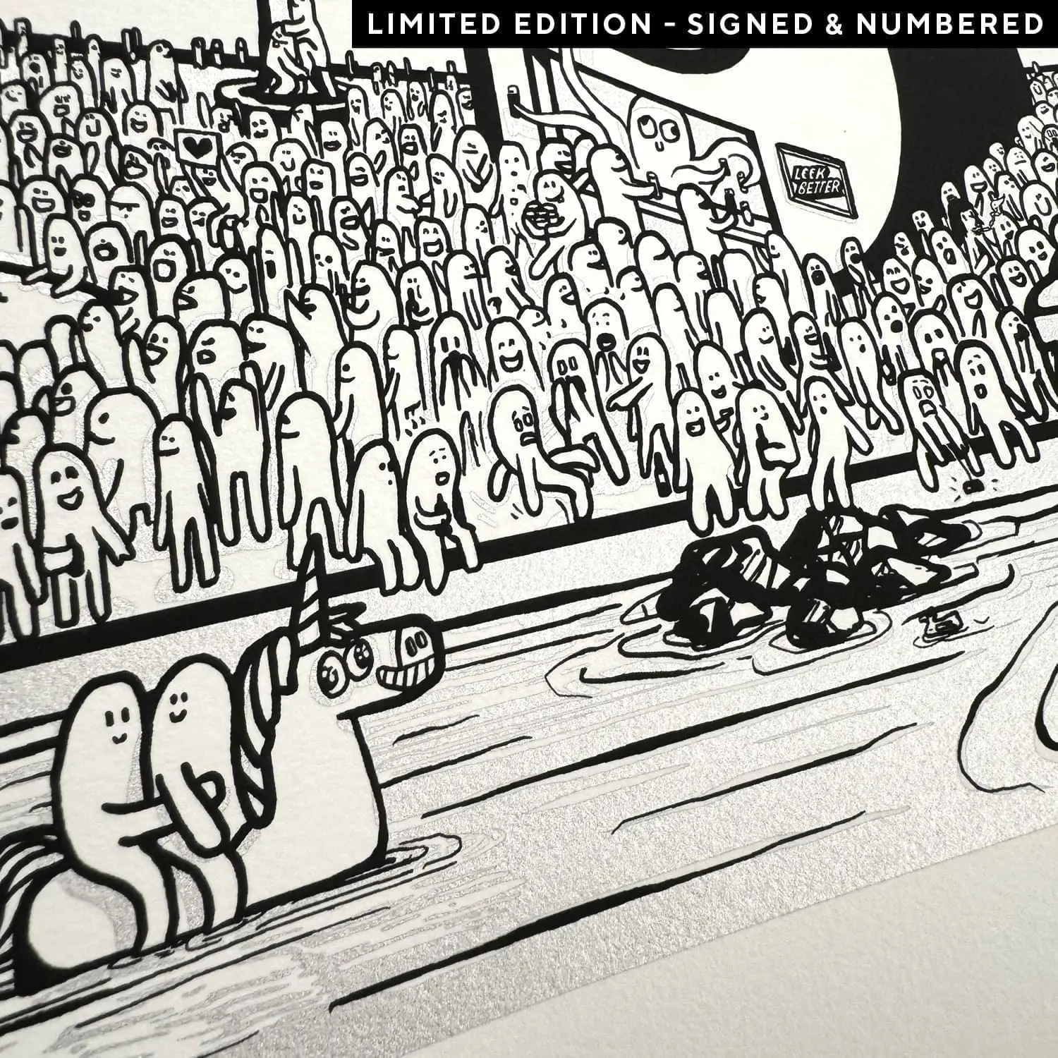 Édition limitée à 100 exemplaires, signée et numérotée. Impression sérigraphie avec pigments argent métallique. Format 70 x 33 cm. Sans cadre.